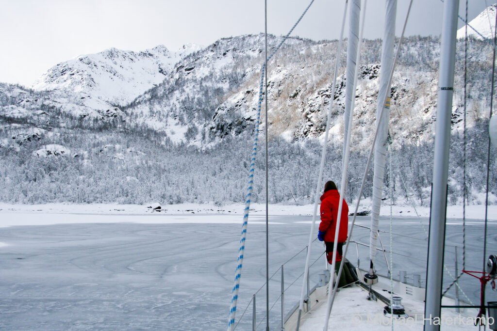 From Egersund northwards some of the fjords may cover with ice, as will shallow anchorages with fresh water entering from rivers or streams, but elsewhere most boats are kept in the water all year. Temperatures at sea level are surprisingly benign; even above the Arctic Circle the temperature is typically around +5°C to -5°C and seldom goes below -10°C. The record nighttime low temperature in Tromsø is only -20°C. Strong winds are more of a problem and a sheltered berth or strong cradle is essential. Again, most of the ice, even deep in the fjords, will be gone by the end of April, unless it is an unusually severe winter.